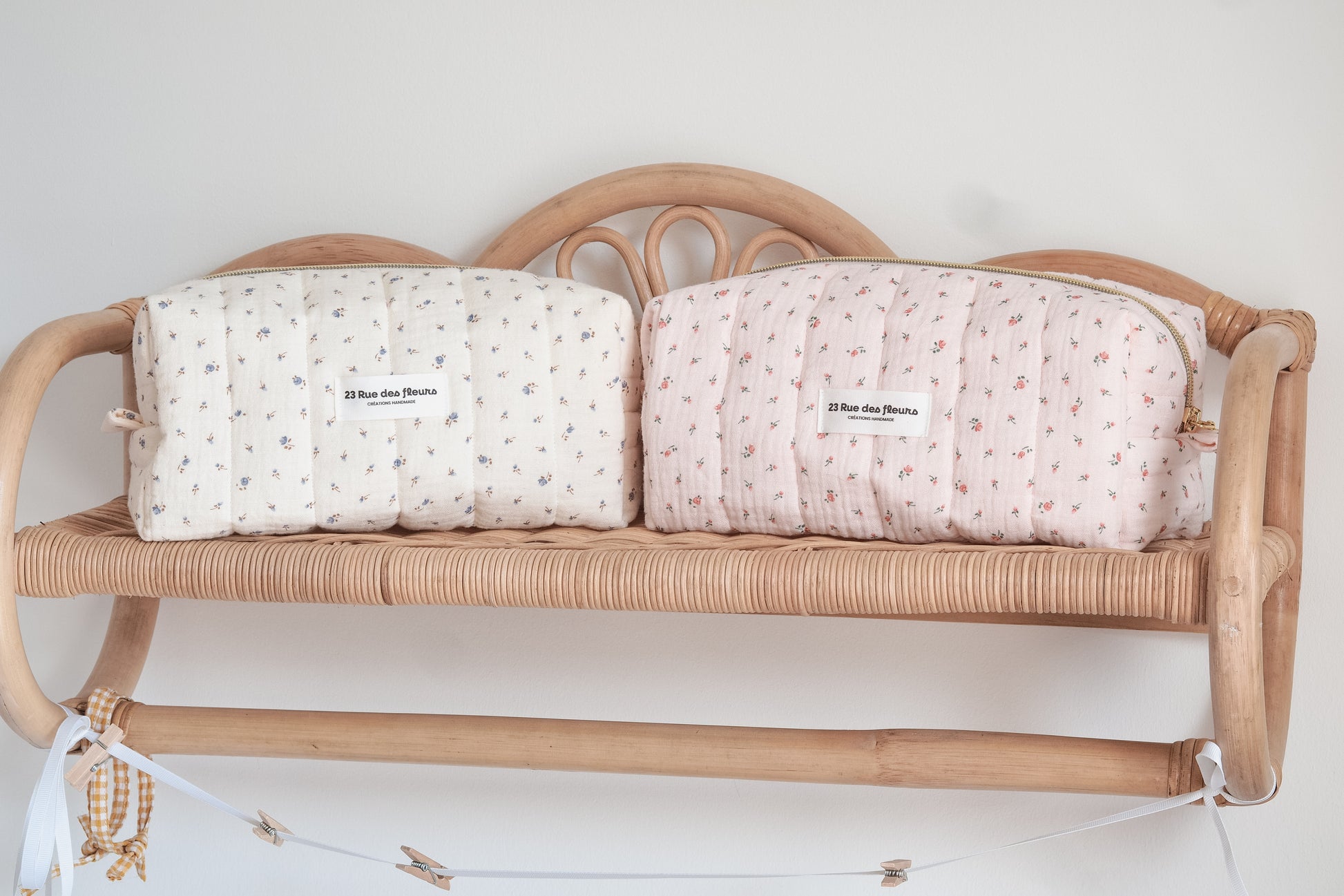 Glissez une touche de douceur dans votre quotidien avec cette trousse de toilette en gaze de coton. Elles rappellent la douceur des pétales et apportent une note poétique à votre salle de bain ou à votre valise. Parfaites à assortir avec le coussin Capucine, elles créent un petit cocon chaleureux et plein de tendresse, comme un bouquet de douceur au fil des jours.