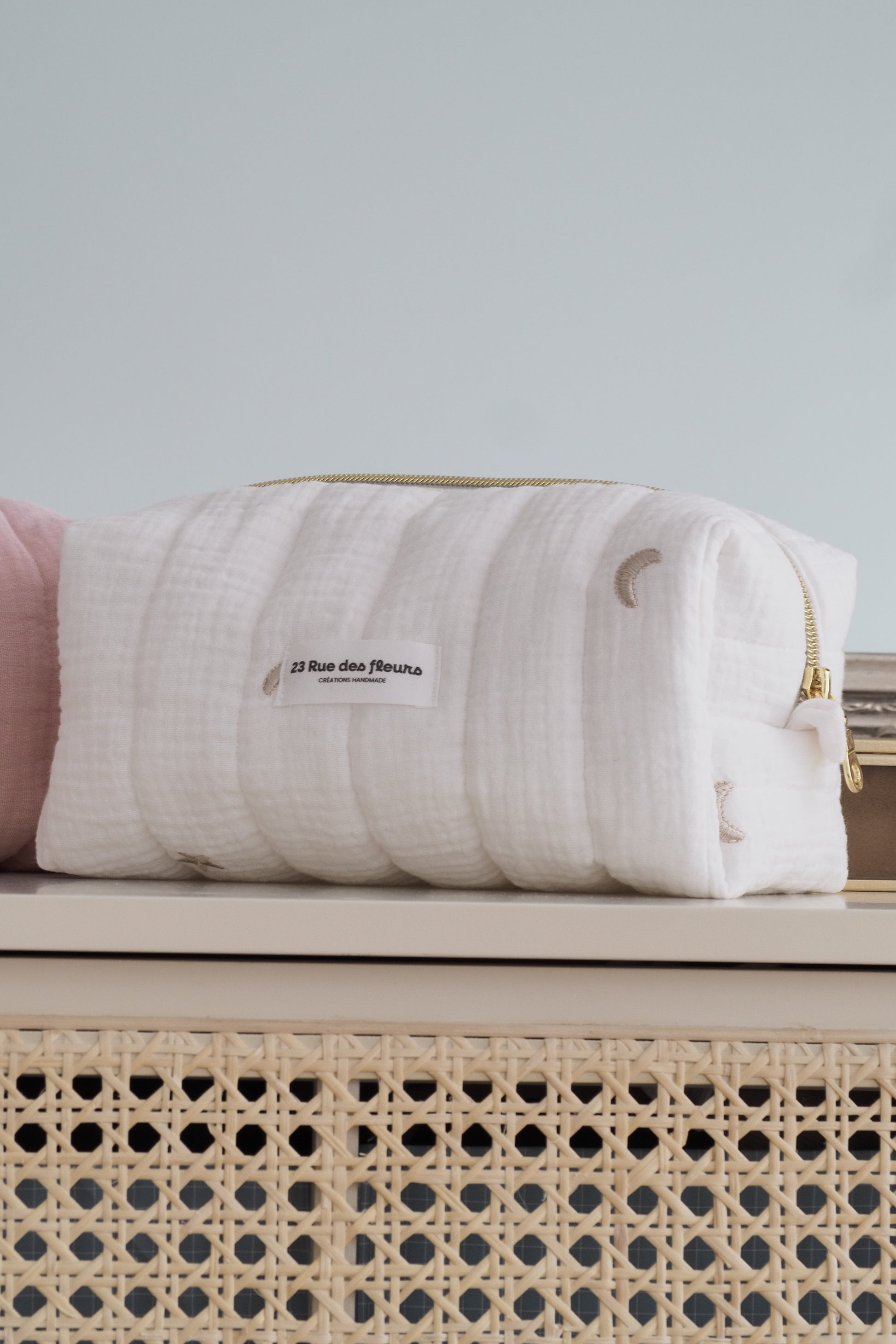 Glissez une touche de douceur dans votre quotidien avec cette trousse de toilette en gaze de coton. Elles rappellent la douceur des pétales et apportent une note poétique à votre salle de bain ou à votre valise. Parfaites à assortir avec le coussin volanté, elles créent un petit cocon chaleureux et plein de tendresse, comme un bouquet de douceur au fil des jours.